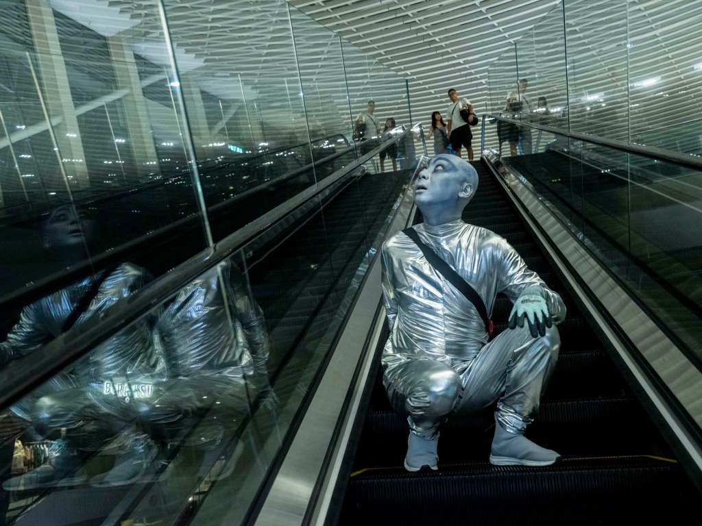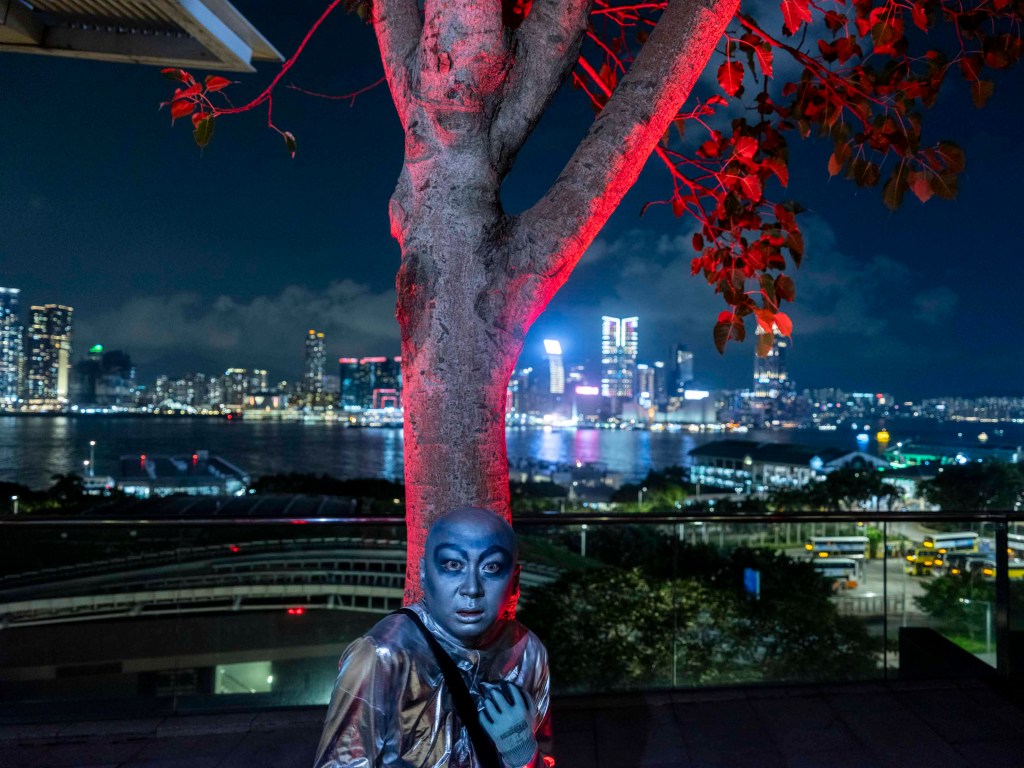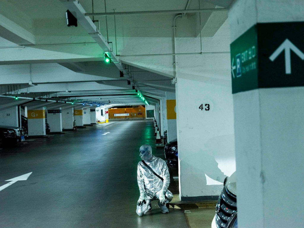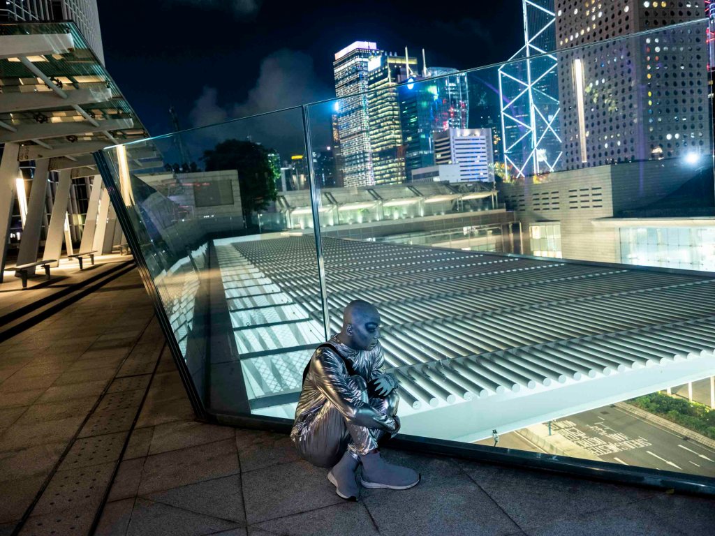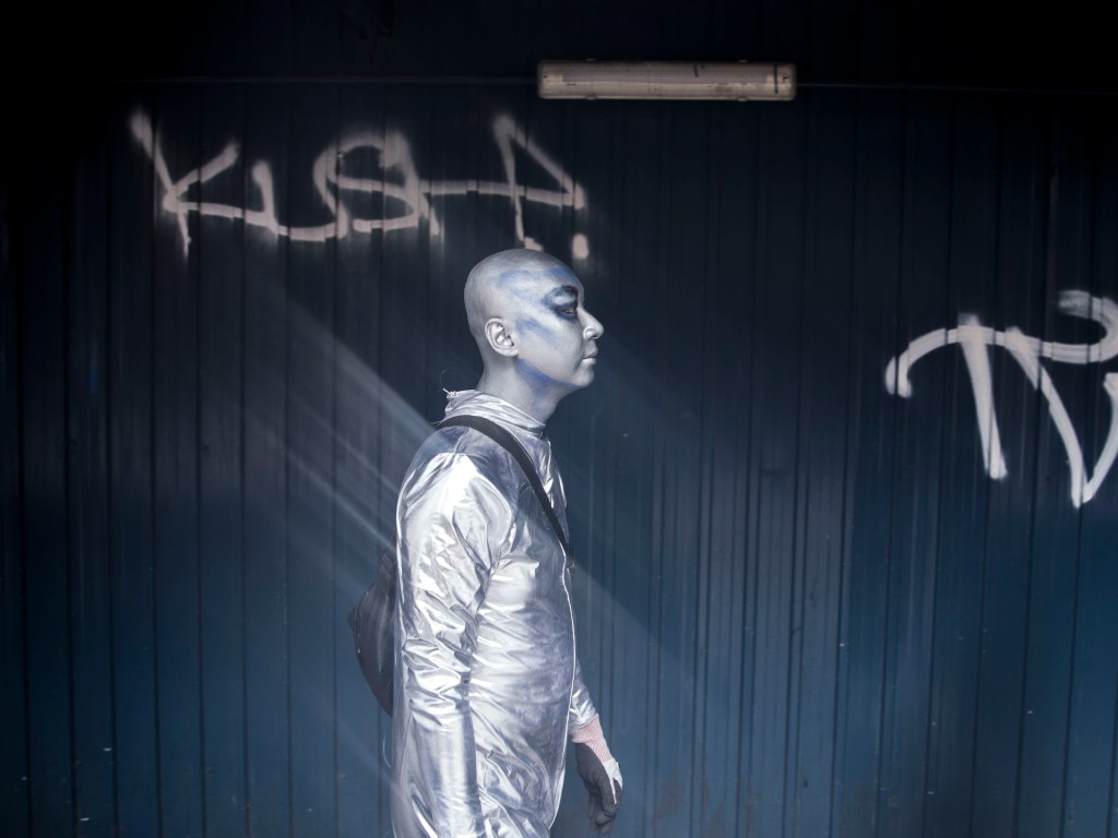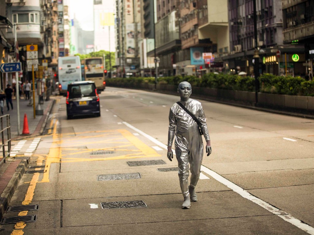 一身銀色反光衣,頭殼光滑圓渾,深藍色上揚斜睥的眼眶,裸露的皮膚全部塗上銀藍色幻光顏料,黑色的隨身斜挎包,一臉妖氣。「外星人」是此刻可樂的身份認同,可樂說只要他能量高的時候就會作外星人打扮,「我跟大廈的垃圾婆聊天時也是這樣穿,樓下保安都習慣了我這形象,也會打扮成外星人去永發茶餐廳吃飯。」