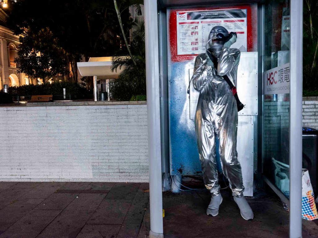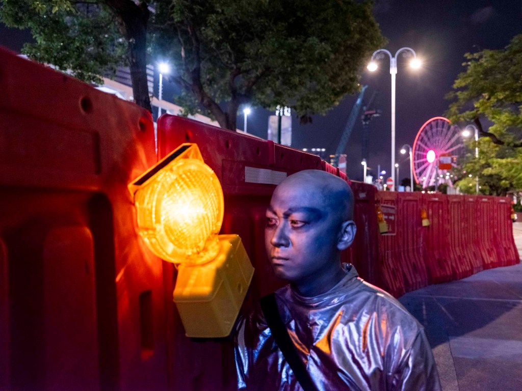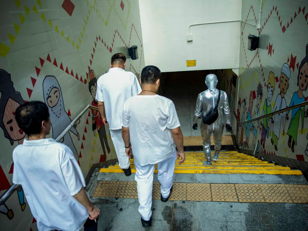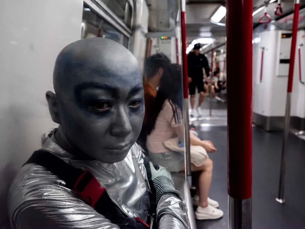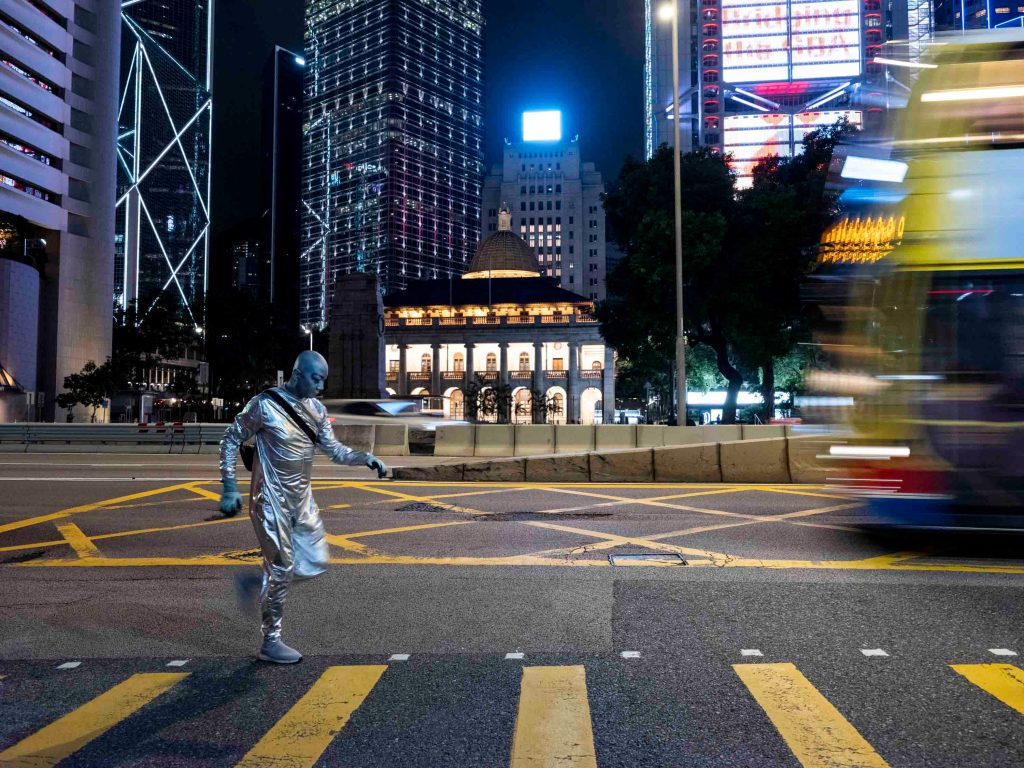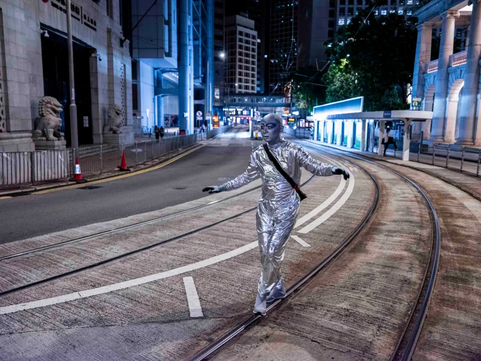 一身銀色反光衣,頭殼光滑圓渾,深藍色上揚斜睥的眼眶,裸露的皮膚全部塗上銀藍色幻光顏料,黑色的隨身斜挎包,一臉妖氣。「外星人」是此刻可樂的身份認同,可樂說只要他能量高的時候就會作外星人打扮,「我跟大廈的垃圾婆聊天時也是這樣穿,樓下保安都習慣了我這形象,也會打扮成外星人去永發茶餐廳吃飯。」